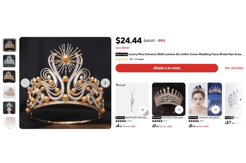 Te recomendamos este videoLa corona que aparece bajo el nombre “Levery Miss Universe 2024 Lumiere De L’Infini Crown” tiene un precio base de 60.07 dólares, pero actualmente está con un 59% de descuento, quedando en 24.44 dólares.