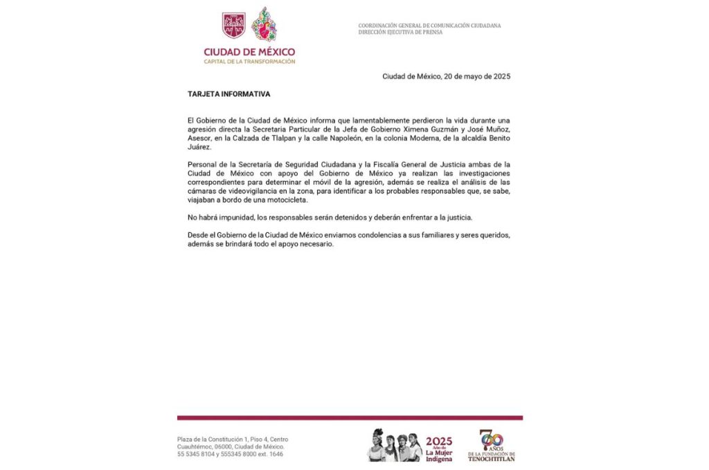 El Gobierno de la Ciudad de México confirmó este 20 de mayo de 2025 un ataque armado en el que perdieron la vida Ximena Guzmán, secretaria particular de la Jefa de Gobierno Clara Brugada, y José Muñoz, quien se desempeñaba como asesor.