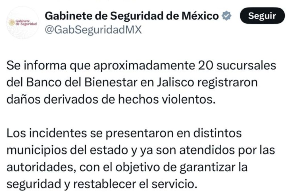 En este contexto, usuarios en redes recomendaron evitar acudir por ahora a cualquier sucursal del Banco del Bienestar en Jalisco hasta que se normalice la operación.