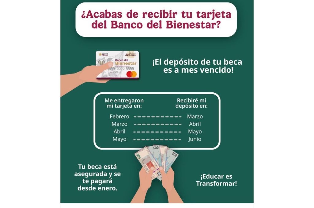 Según lo indicado por el titular de la Coordinadora, Julio León, el primer depósito de la Beca Benito Juárez, así como de la Beca Jóvenes Escribiendo el Futuro destinada para estudiantes universitarios, se realiza a mes vencido, es decir, un mes después de haber recibido el plástico.