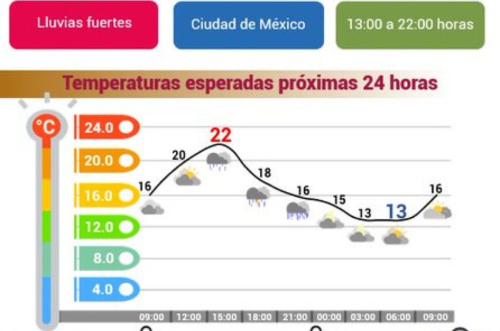 En cuanto a la Ciudad de México, el ambiente será cálido, aunque con cielo nublado durante todo el día y con lluvias muy fuertes (de 15 a 49 mm), actividad eléctrica y posible caída de granizo a partir de las 13:00 horas.