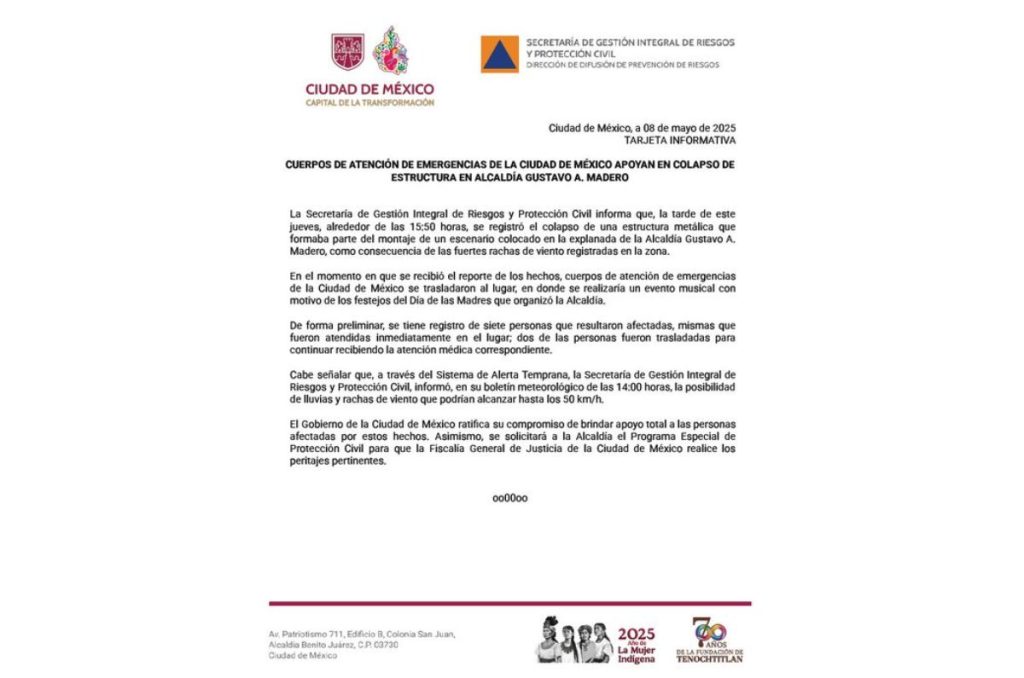 Lo que sería una tarde de música y celebración por el Día de las Madres terminó en un susto colectivo en la alcaldía Gustavo A. Madero, al norte de la Ciudad de México. La tarde del jueves 8 de mayo de 2025, una fuerte ráfaga de viento y la lluvia que comenzó a caer poco antes del evento provocaron el colapso del escenario montado para el show gratuito de Alicia Villarreal, Ana Cirré y Ángela Carrasco.