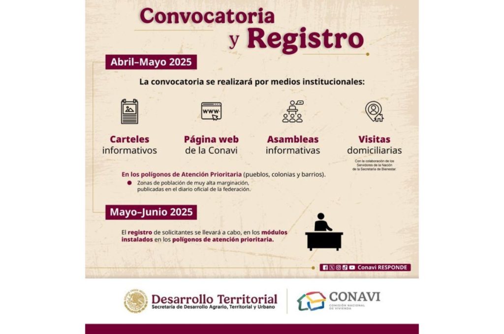 La Comisión Nacional para la Vivienda confirmó que la convocatoria para las zonas prioritarias del Edomex saldrá en mayo 2025. Posteriormente, entre mayo y junio, comenzará el proceso de inscripción en los módulos establecidos dentro de colonias, pueblos y barrios con altos niveles de marginación e inseguridad.