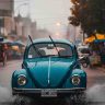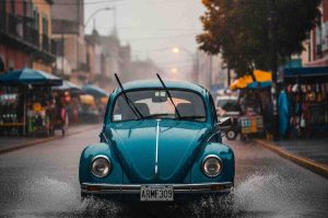 La imagen captura la realidad de las lluvias en CDMX, mostrando un vehículo avanzando con dificultad por una calle mojada, bajo la cortina de una fuerte tormenta, ilustrando el impacto de las precipitaciones en la visibilidad y las condiciones de manejo.