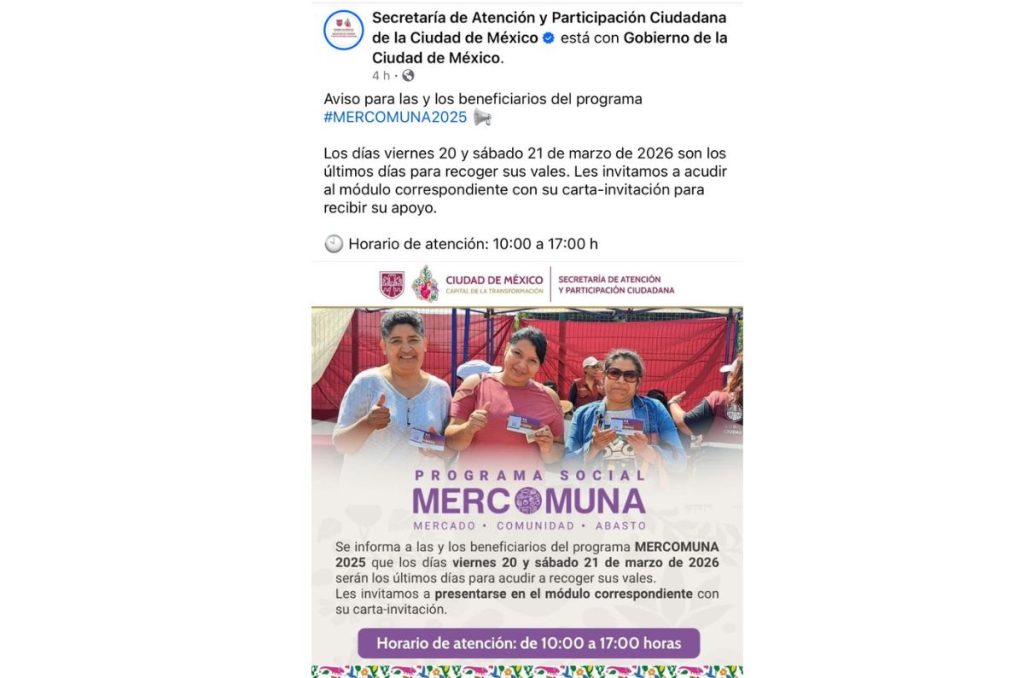 Si eres beneficiario de Vales Mercomuna este 2026, hay una fecha que no puedes dejar pasar. Autoridades de la Ciudad de México confirmaron que el viernes 20 y sábado 21 de marzo son los últimos días para recoger los vales del programa.