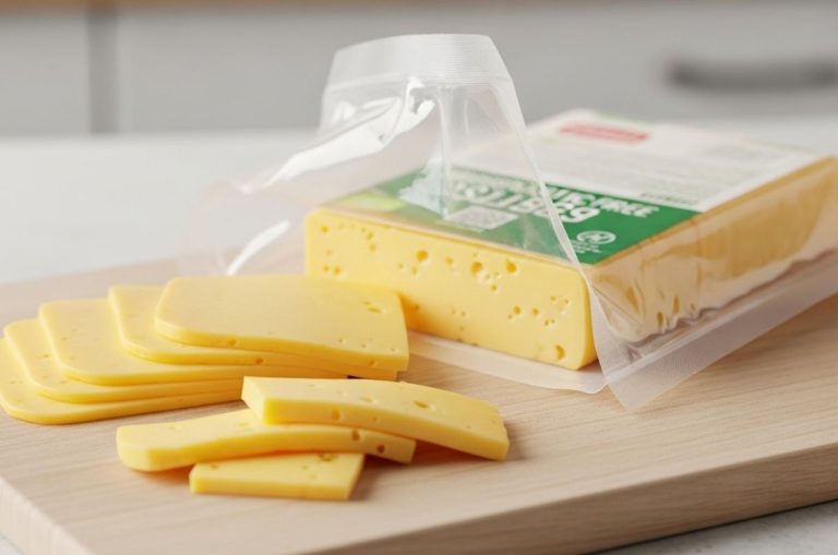 La imagen muestra un empaque del queso sin microplásticos “Great Value” de queso amarillo en rebanadas, abierto sobre una tabla de cortar, con varias rebanadas listas para usarse, destacando la accesibilidad y practicidad de este producto.