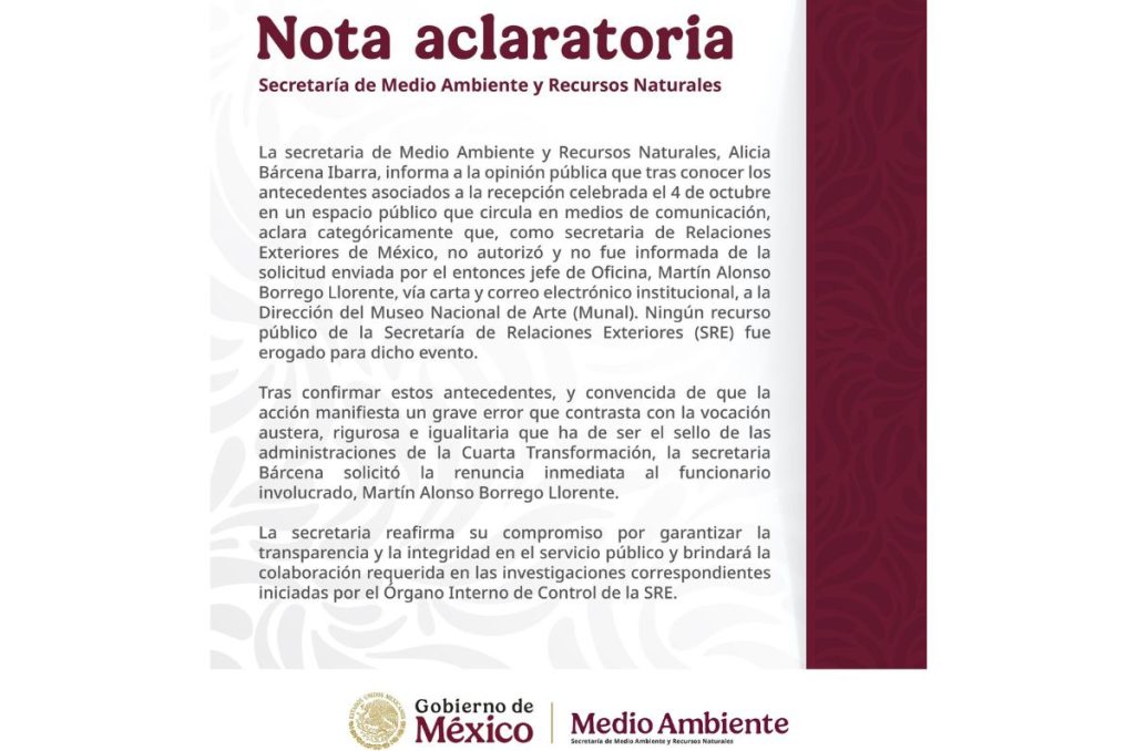 A travez de un breve comunicado compartido en su cuenta oficial de X, la Semarnat confirmó que Alicia Barcenas Ibarra, titular de la secretaría, no tenía conocimiento de la solicitud enviada por el funcionario y que ningún recurso público se utilizó para el evento.