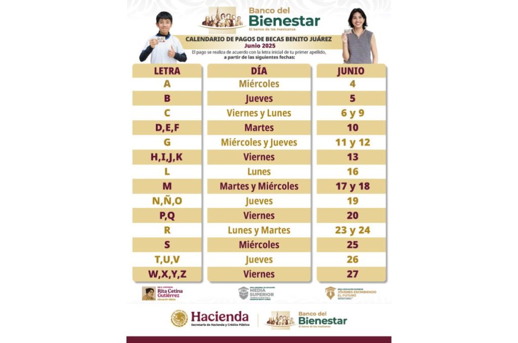 Ya tenemos calendario de pagos de la Beca Rita Cetina para estudiantes de secundaria, y las primeras personas en recibir su dinero lo harán este mismo miércoles 4 de junio. El calendario fue compartido por el Banco del Bienestar y está basado en la letra inicial del primer apellido de las y los beneficiarios.