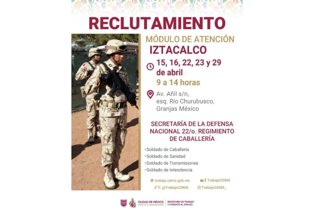 El anuncio lo dio a conocer la Secretaría de Trabajo y Fomento al Empleo de la CDMX a través del Periódico de Ofertas de Empleo. El objetivo es facilitar el ingreso de ciudadanos interesados en sumarse al servicio militar activo bajo diferentes áreas operativas.