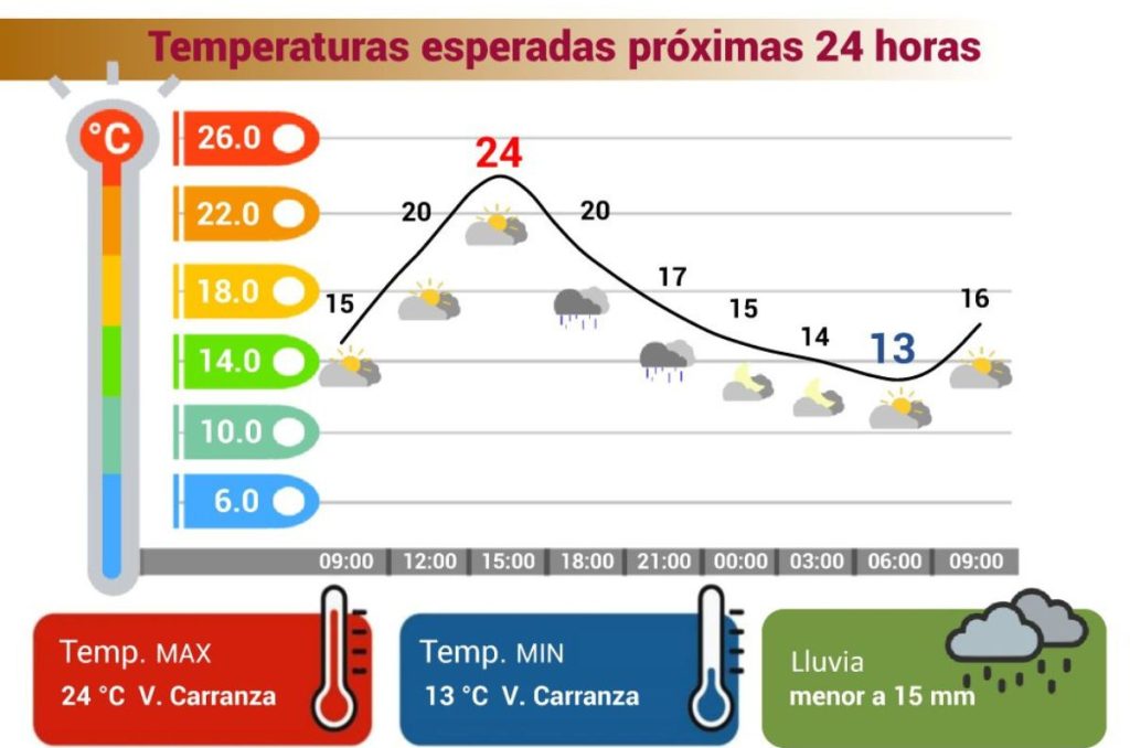 La temperatura máxima esperada será de 24 ºC mientras que la mínima será de 13 ºC. Por otro lado, la calidad del aire se mantendrá en niveles buenos de contaminación, representando un riesgo muy bajo para las personas.
