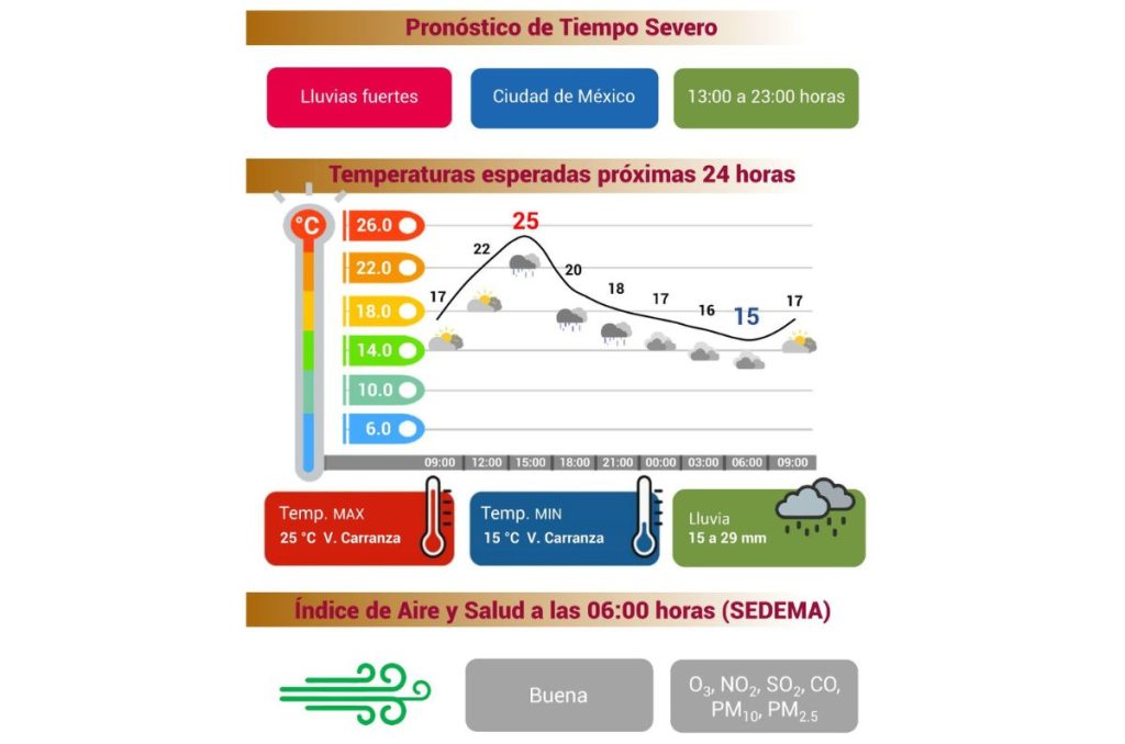 Por su parte, la Ciudad de México tendrá un ambiente cálido y caluroso en gran parte del día, con temperaturas máximas de 25 °C y mínimas de 15 °C. Además, a partir de las 15:00 horas se esperan lluvias fuertes de 15 a 29 mm, con actividad eléctrica y posible caída de granizo durante la noche.