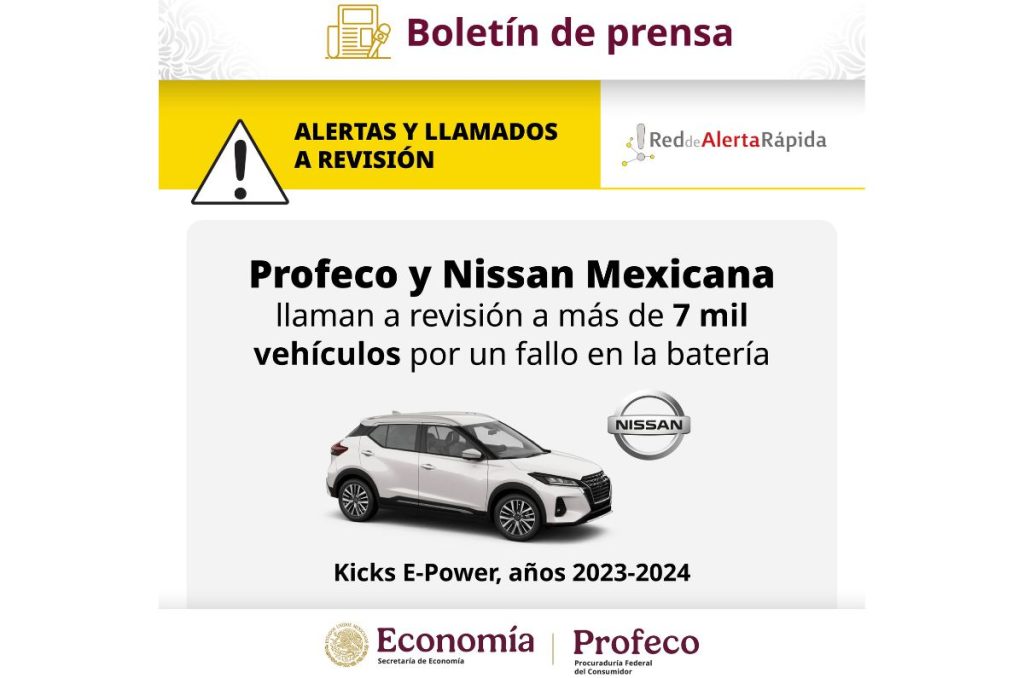A través de una alerta rápida compartida en sus redes sociales, la Procuraduría Federal del Consumidor (Profeco) y Nissan Mexicana informaron que 7 mil vehículos Nissan Kicks E-Power serán llamados a revisión debido a una falla presentada en la batería.