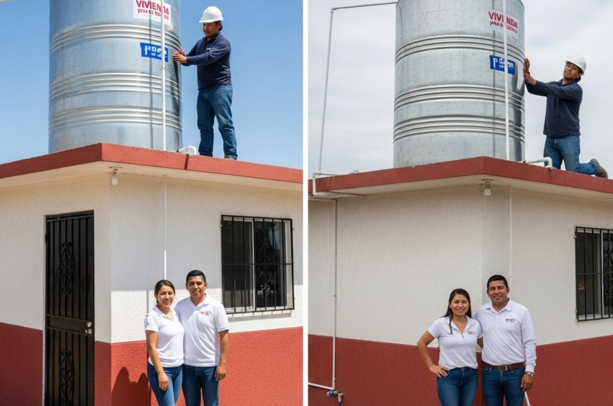 La imagen muestra un tinaco gratis en Edomex de agua, listo para ser instalado, representando el beneficio principal del programa Vivienda para el Bienestar, que busca mejorar el acceso al agua para las familias mexiquenses.