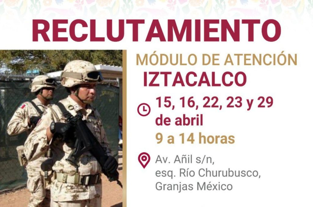 Si estás buscando trabajo y te interesa formar parte del ejército mexicano, te tenemos buenas noticias, pues la Secretaría de la Defensa Nacional (SEDENA) continúa realizando reclutamientos presenciales en la Ciudad de México, concretamente en la Alcaldía Iztacalco.