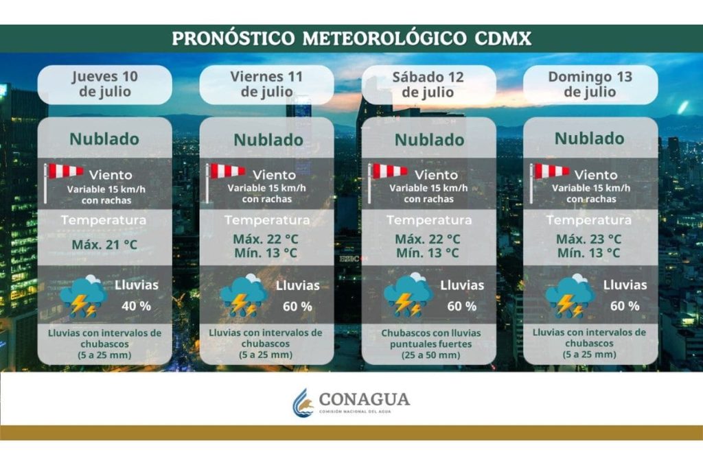 Por su parte, el pronóstico del clima hoy 11 de julio indica que la Ciudad de México mantendrá un ambiente nublado, con temperaturas máximas de 22 °C y mínimas de 13 °C. Además, el porcentaje de lluvia es del 60%, con posibilidad de chubascos y lluvias puntuales fuertes.
