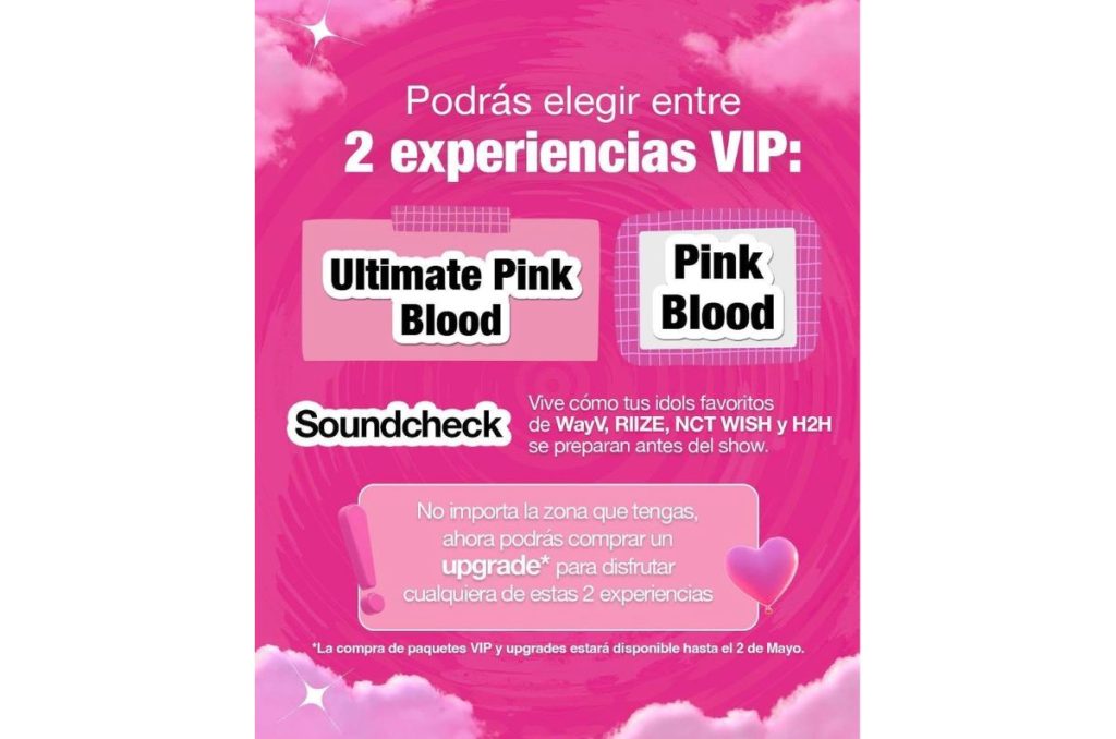 - Experiencia VIP Pink Blood (upgrade): $6,724.00 MXN (no incluye boleto base)