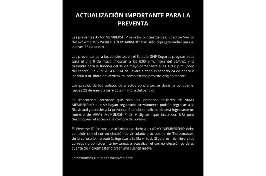 Los conciertos del esperado BTS WORLD TOUR /ARIRANG’ en el Estadio GNP Seguros de Ciudad de México, programados para el 7, 9 y 10 de mayo de 2026, siguen en pie, pero las fechas para acceder a la preventa exclusiva cambiaron.