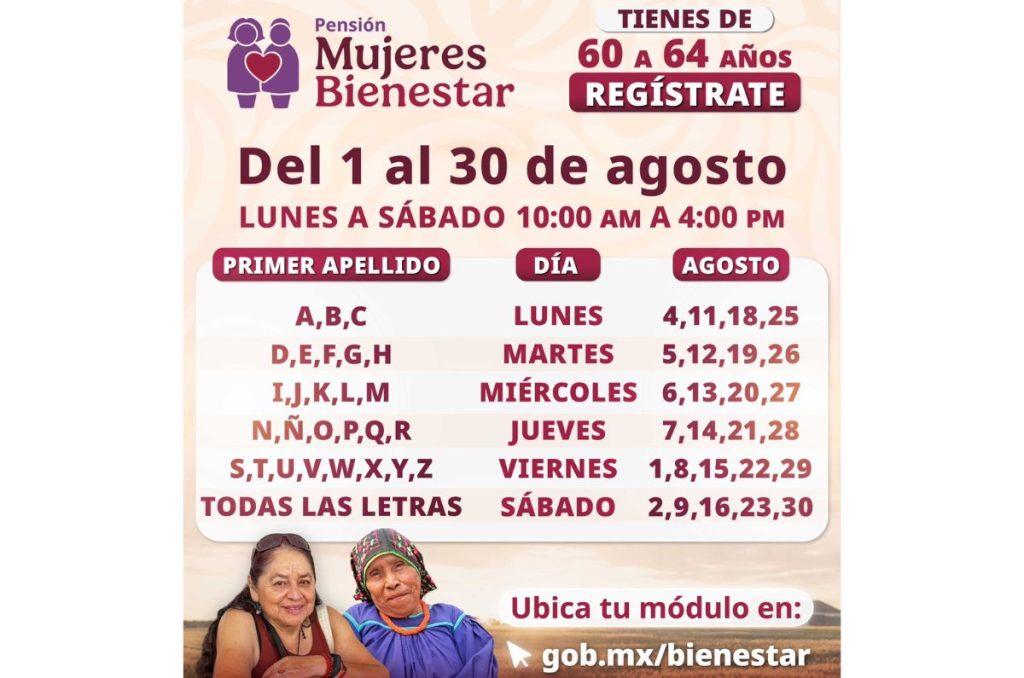 Si cumples con todos los requisitos y quieres formar parte del programa, aquí te dejamos el calendario completo de registro a la Pensión Mujeres Bienestar para el mes de agosto.