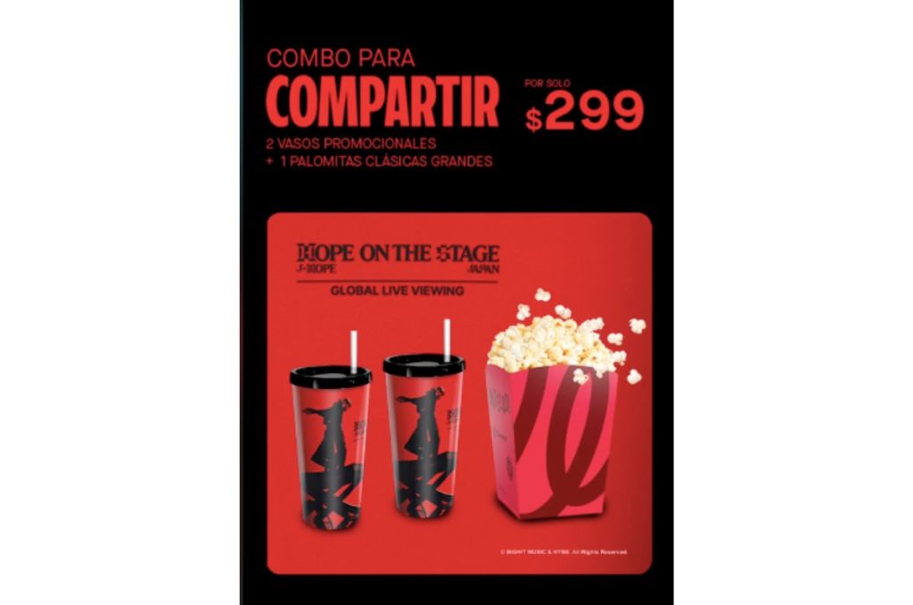 Este combo especial incluye dos vasos coleccionables y palomitas grandes. Solo estará disponible en funciones seleccionadas del concierto de J-Hope en cines mexicanos.